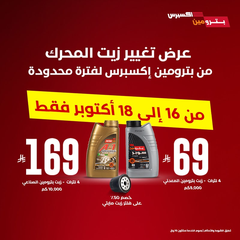 - 69 ريال – لكل 4 لترات من زيت بترومين المعدني (5,000 كم)