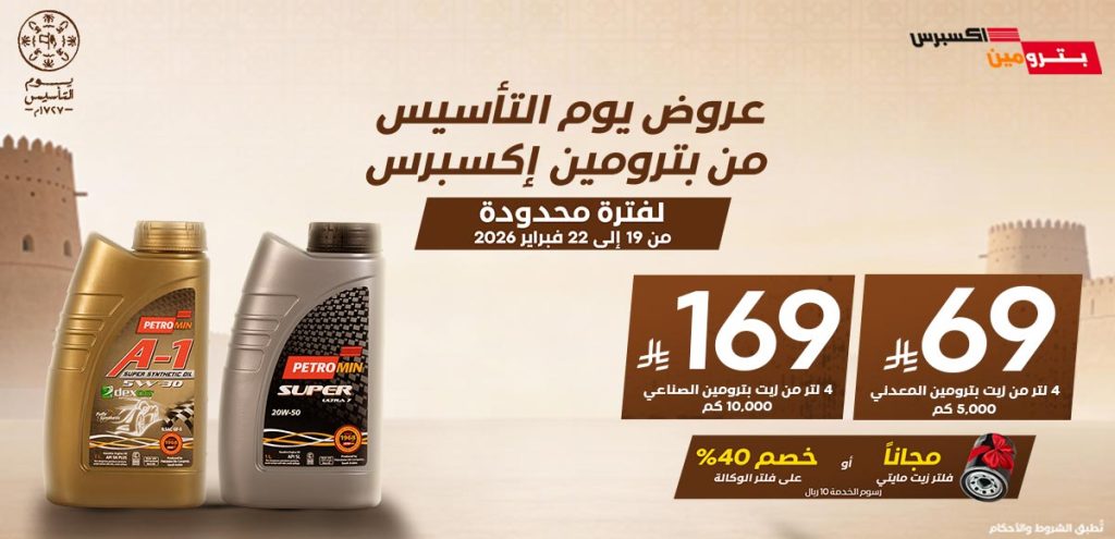 - ينطبق زيت بترومين المعدني (10W30) في هذا العرض فقط من خلال الزيت السائب ولا يشمل العبوات